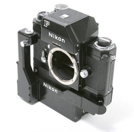 黑色尼康F机身,带有Photomic FTn取景器,F-36电动机驱动器和无绳电池组以及用于相机和电池组的盒子。
