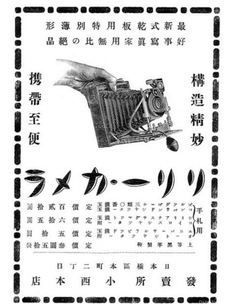 The Lily 莉莉 (リリー) 所述百合(リリー)是由Rokuoh-SHA,小西六或小西六的制造分支(日本柯尼卡的前身)。本页介绍的是1909年推出的原始铁氟龙 tefuda(含义参看我之前的这个内容) 尺寸的竖拍版本型号,称为Lily Hand Camera(百合手持相机),然后是Lily No.2(百合2号)或者百合水平版本的发行。
