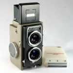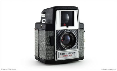 该电子测光127双反相机是铸造金属盒相机127 rollfilm在4×4cm的照片。它由Bell&Howell于1958年推出。