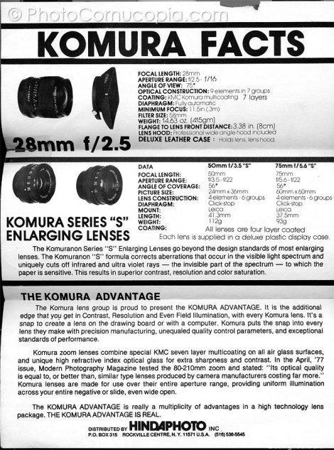 下面的广告剪报[3]描述了Komuranon-S镜头的主要特征和规格,但没有说明它们与相同焦距的早期Komuranon-E镜头有何不同。Komuranon-E 5.6 / 75和3.5 / 50具有与4组相同的6个元件的镜头结构,并且重量与Komuranon-S 5.6 / 75和3.5 / 50完全相同,因此Komuranon-E和Komuranon-E S镜头要么完全相同,要么可能进行了微小且可能无关紧要的更改,但这只是猜测,直到有证据表明不是这样。