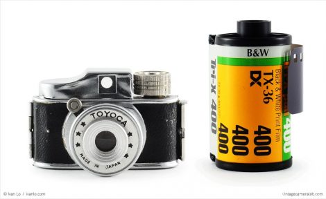 Toyoca Hit 是一款非常简单的相机。 定焦镜头的固定光圈约为f/11,由一个非常简单的 常闭快门控制 ,只要快门杆(位于镜头筒上10点钟的位置)被按住,它就会保持打开状态。构图是通过相机顶部的微型取景器完成的,一旦曝光,取景器旁边的旋钮可以用来推进17.5毫米的纸质底片,底片的帧号可以通过背面的红色窗口看到。