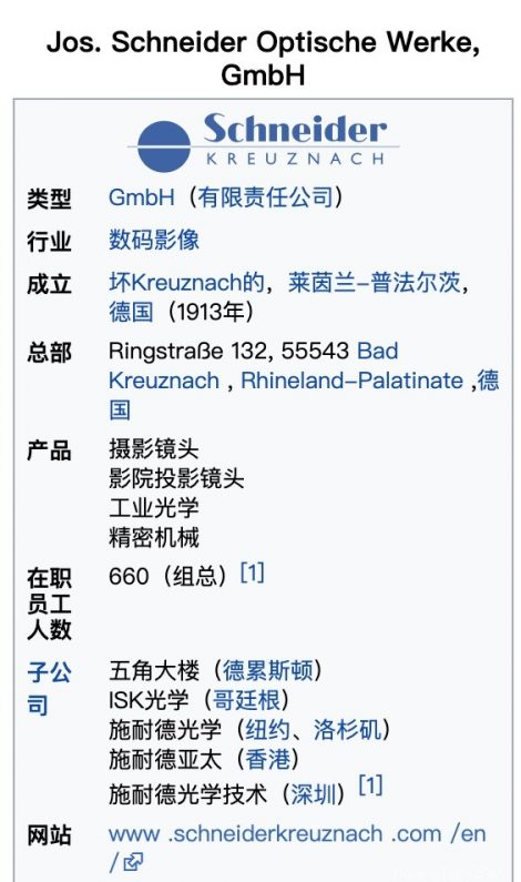 Schneider Kreuznach(德语发音:[ˌʃnaɪdɐ ˈkʁɔʏtsnax])是Jos. Schneider Optische Werke GmbH公司的缩写名称,有时也简称为Schneider。他们是工业和摄影光学的制造商。该公司成立于1913年1月18日由约瑟夫·施耐德为OPTISCHE Anstalt乔斯。施耐德&有限公司在坏Kreuznach的在德国。1922 年,公司更名为Jos. Schneider & Co., Optische Werke, Kreuznach,并于 1998 年更名为现在的Jos. Schneider Optische Werke GmbH。