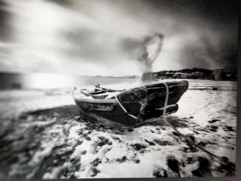 8X10针孔一《舞动的丝巾》拍摄40秒,夲欲只拍冬季雪地孤寂的木船,恰遇女子来船边照像,未加阻拦,遂成此意像,全赖针孔可长曝。