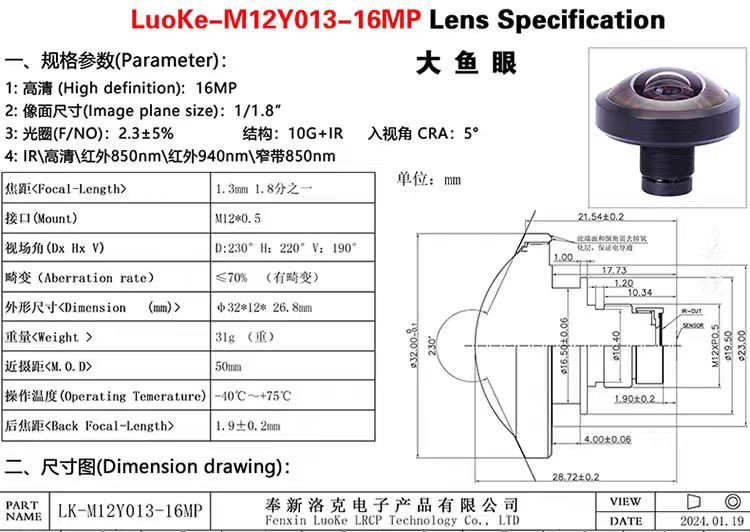 LuoKe-M12Y013-16MP Lens Specification 1.3MM 大鱼眼镜头