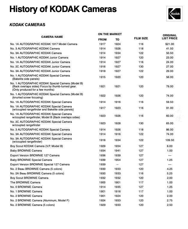 | No. 1 AUTOGRAPHIC KODAK Junior Camera | 1914 | 1927 | 120 | 23.00 |