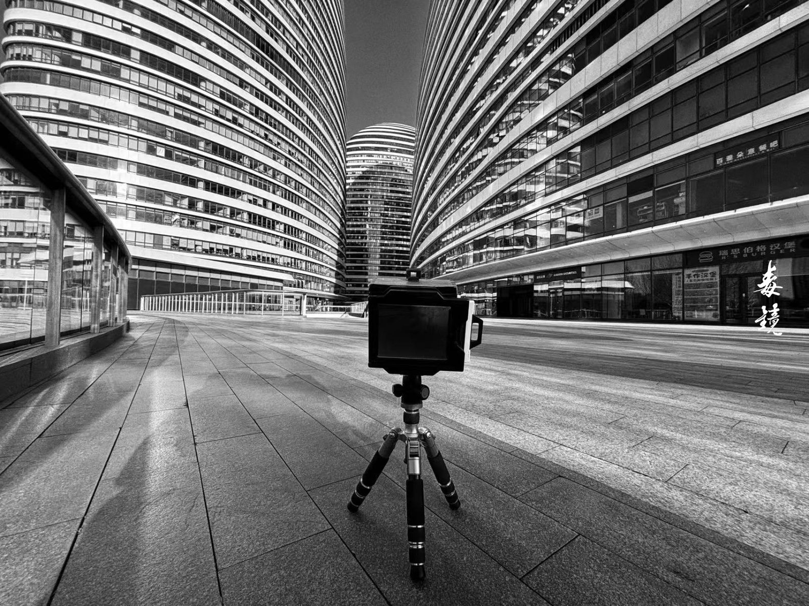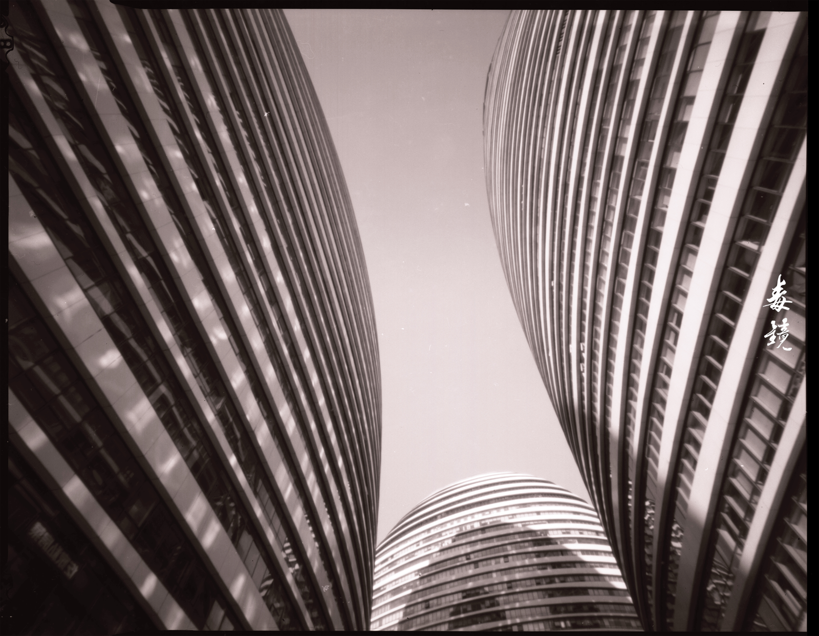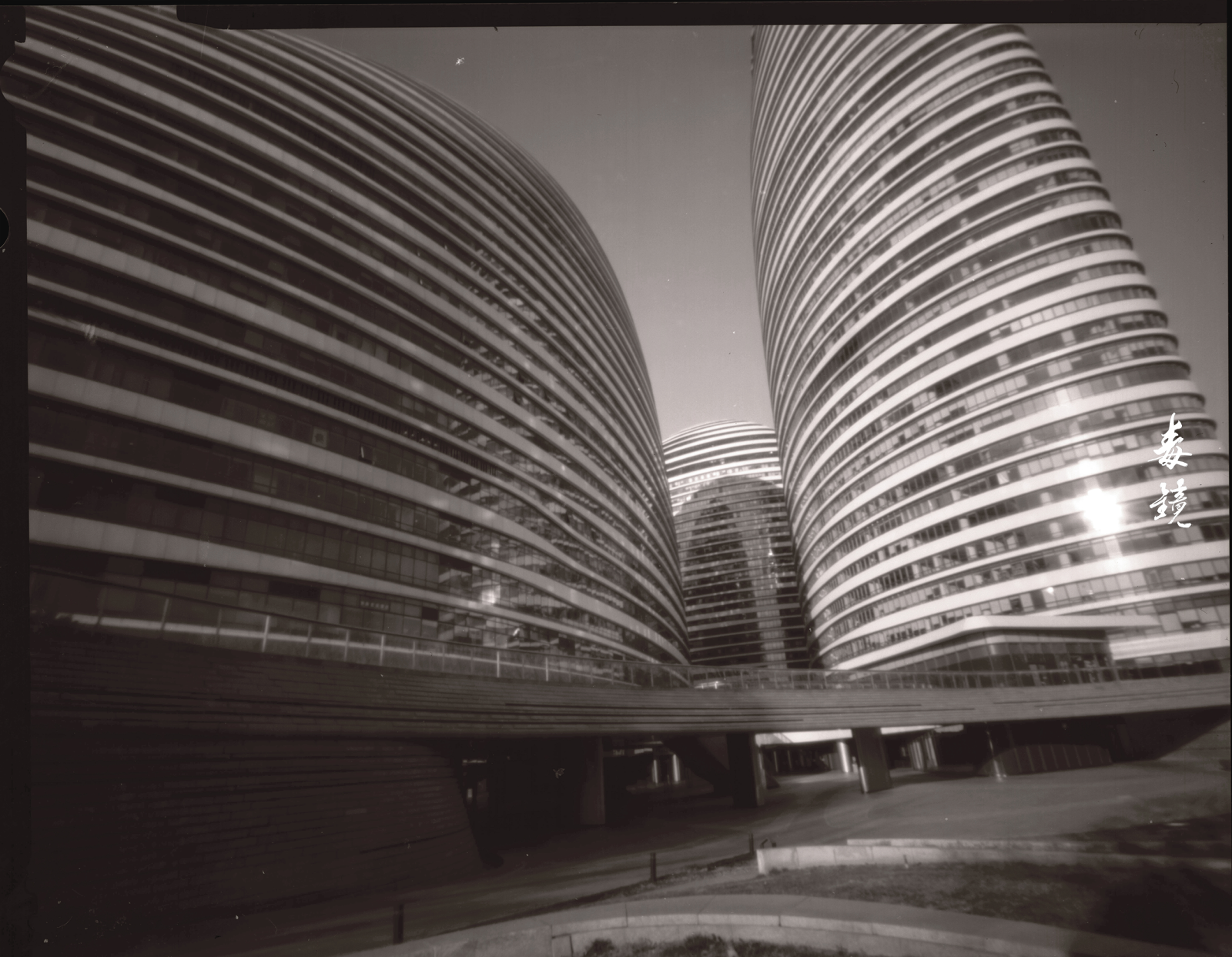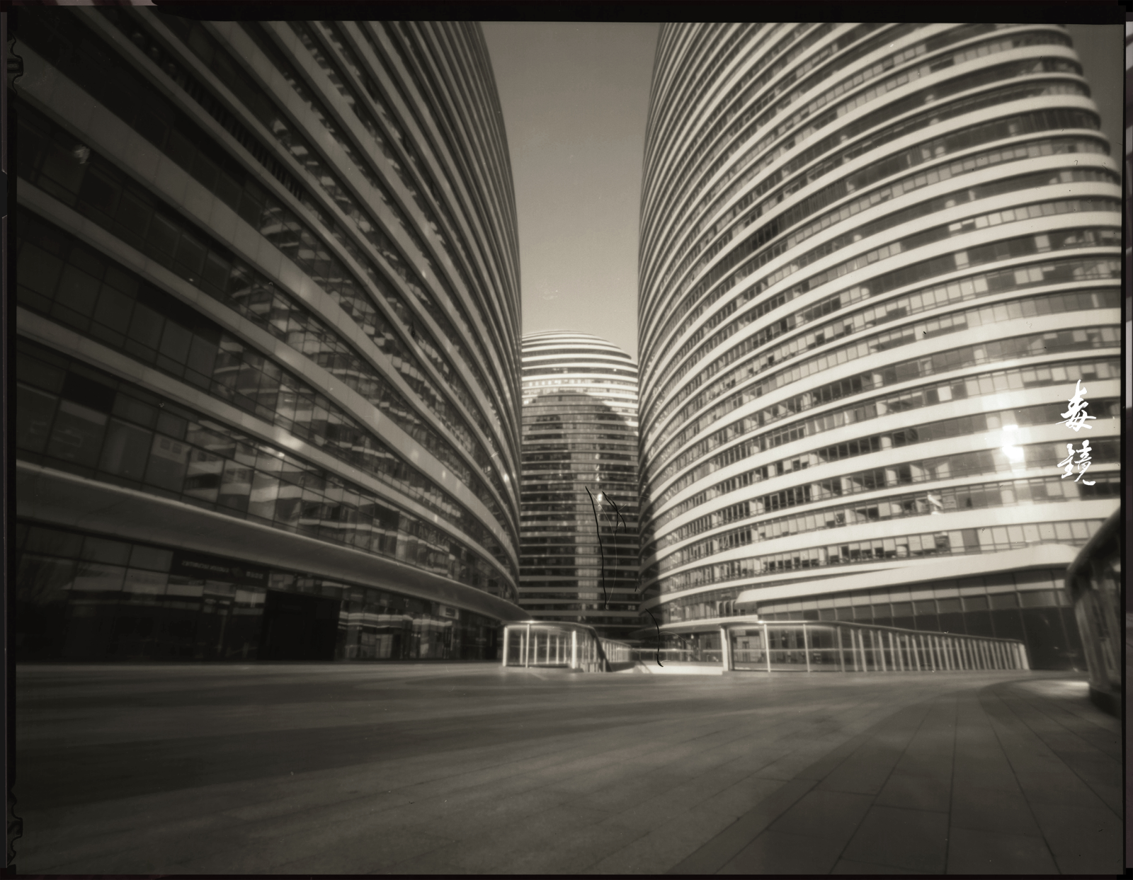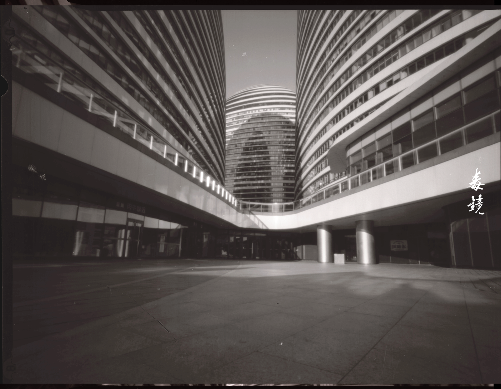 拍望京SOHO的时候,那现代感十足的曲线配合针孔特有的边缘失光(也就是暗角),有种奇异的张力,中间亮四周黑,现代建筑也拍出了神秘的“孤岛”感。