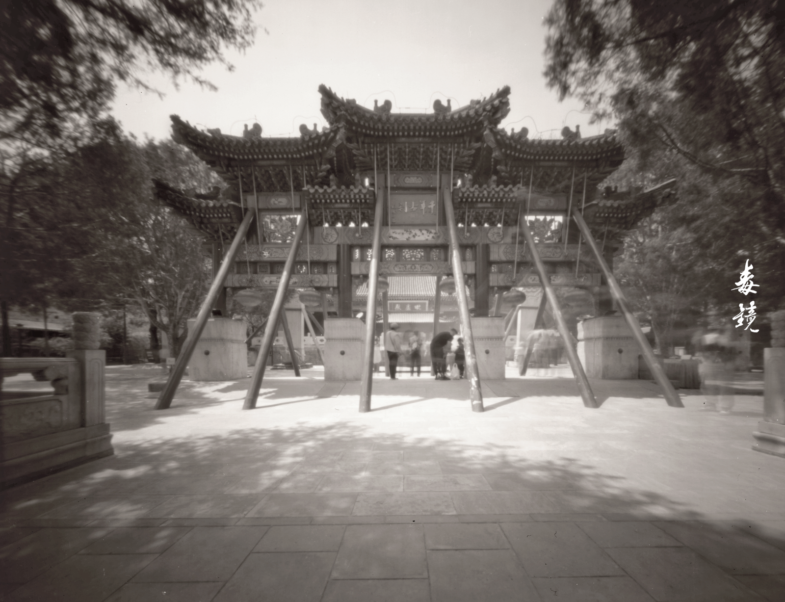 在大观园和云居寺,我倒觉得针孔那些所谓的“毛病”成了宝贝。比如抗逆光差、爱起眩光,放在这些古建筑里反而成了营造梦幻氛围的利器。长曝光让寺庙里走来走去的人影全变成了虚无,只剩下静穆的石塔和斑驳的光影,如济慈诗里说的,“仿佛天使的泪水悄然滑落,寂静无声”