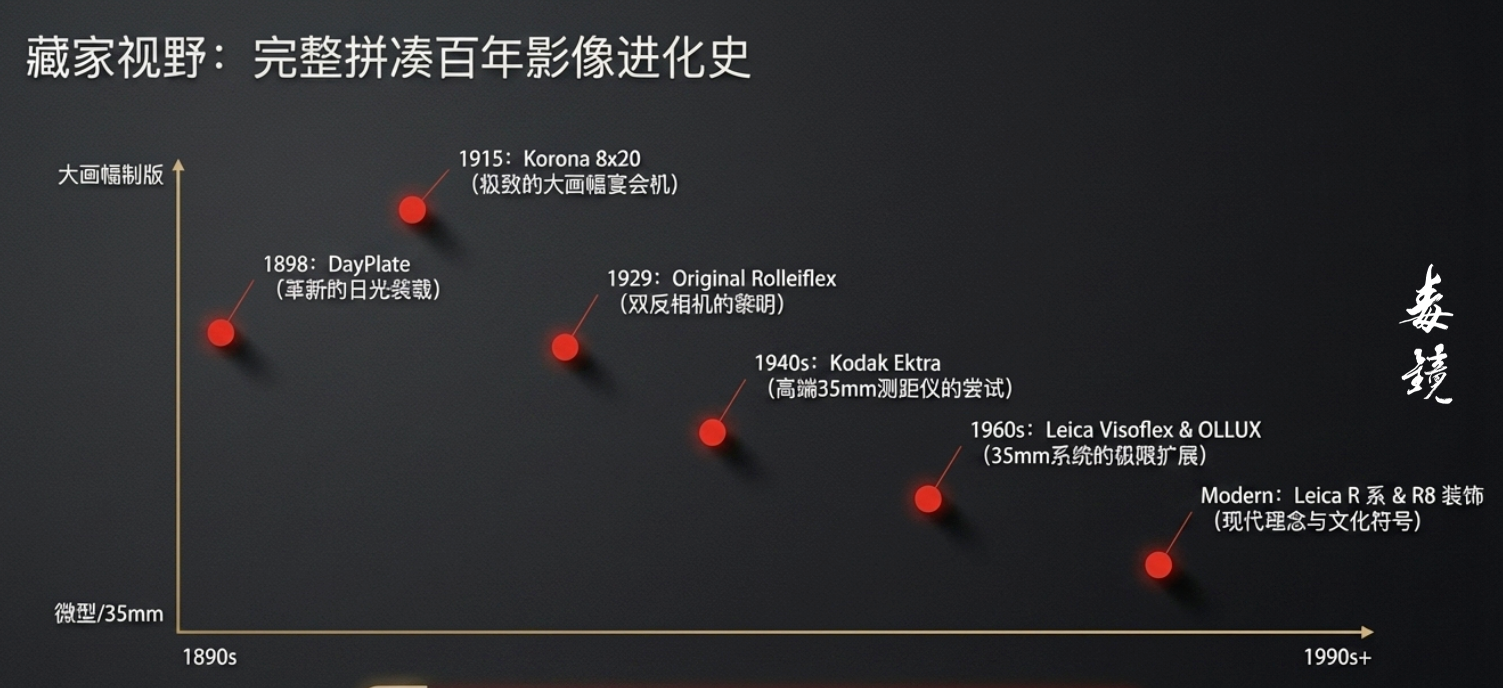 | 大画幅相机 (Large Format) | 4×5, 8×10, 8×20英寸 | Deardorff 8×10、Korona全景座机、未知名4×5座机 | 数量较少,多为木制座机(View Camera)或外拍机(Field Camera),具极高收藏价值。 |