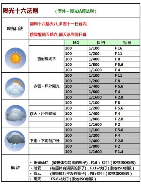 2. 第二步:如果天气晴朗就把光圈设为f16,如果稍有一点阴就把光圈设为f11,如果天阴就把光圈设为f8,如果天气非常阴沉就把光圈设为f5.6
