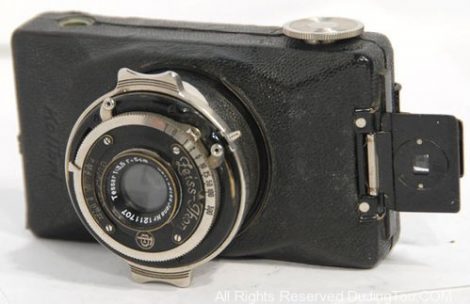 将一颗Kolibri18分之523被制成蔡司在德国,c.1930-1935; 在127部电影上拍摄了16张3x4cm的曝光。该相机配有可折叠的镜筒,并以垂直格式排列,顶部有一个上翻取景器。在右侧是旋转旋钮和三脚架衬套; 底部还有另一个三脚架布什。镜头两侧都有小“脚”,因此相机会水平站立,并且可以在镜头下方固定支柱以垂直平衡相机。背面有两个红色窗口,用于小图像格式。有一种补充特写镜头,称为Proxar,可以聚焦到30厘米。